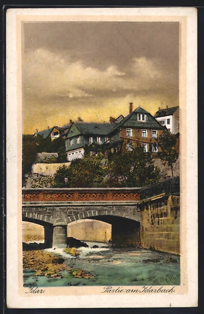 AK Idar, Partie am Idarbach, Brücke, Wohnhäuser