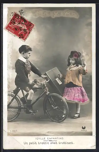 AK Idylle Enfantine, Un petit trottin allait trottinant, kleiner Radfahrer und Mädchen