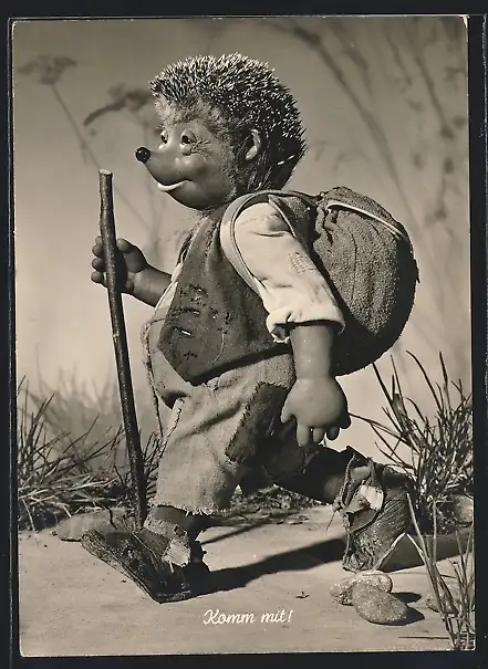 AK Igel Mecki geht auf Wanderschaft mit Rucksack und Stab