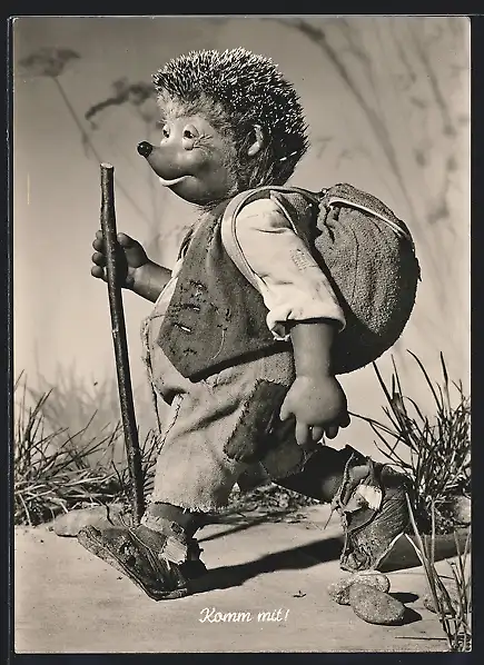 AK Igel Mecki geht auf Wanderschaft mit Rucksack und Stab