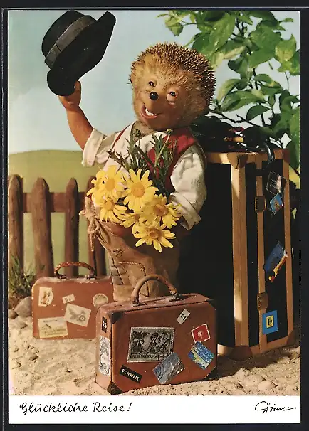 AK Igel Mecki mit Koffern und Blumen geht auf grosse Reise