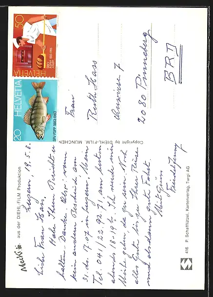 Personenbezogene Daten auf der Rückseite der Karte wurden durch blauen Textmarker unkenntlich gemacht. Die blauen Stellen sind auf die Vorderseite durchgeweicht und wirken sich negativ auf das Postkartenfoto aus