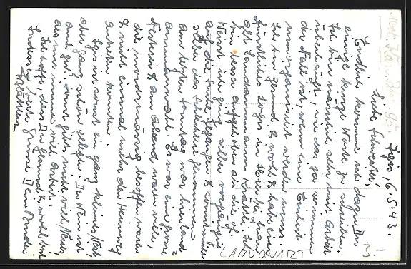 Personenbezogene Daten auf der Rückseite der Karte wurden durch blauen Textmarker unkenntlich gemacht. Die blauen Stellen sind auf die Vorderseite durchgeweicht und wirken sich negativ auf das Postkartenfoto aus
