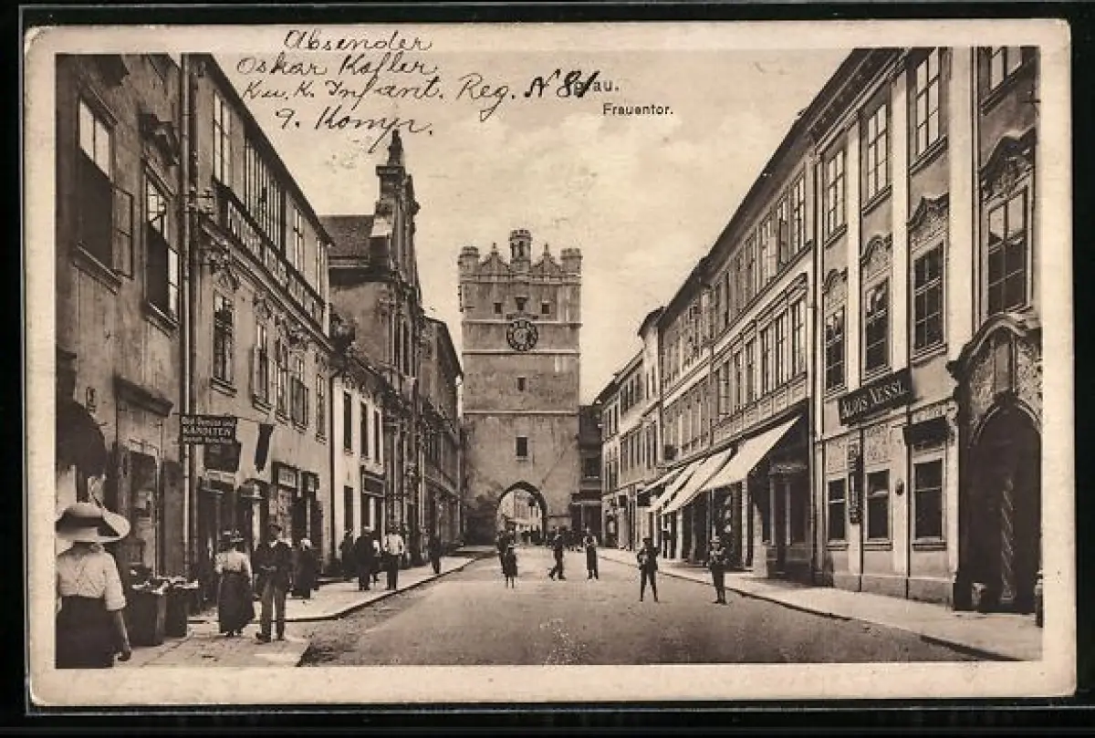 AK Iglau, Frauentor mit Strasse und Geschäften