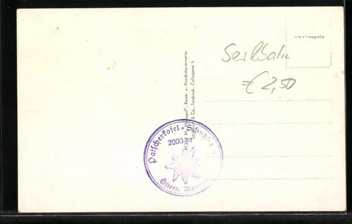 Personenbezogene Daten auf der Rückseite der Karte wurden durch blauen Textmarker unkenntlich gemacht. Die blauen Stellen sind auf die Vorderseite durchgeweicht und wirken sich negativ auf das Postkartenfoto aus