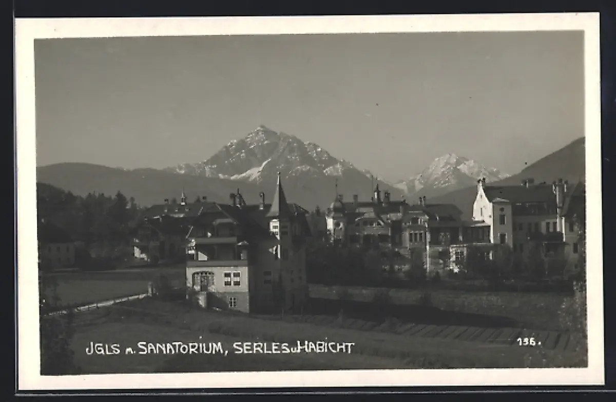AK Igls, Sanatorium im Ort, Blick gegen Serles u. Habicht