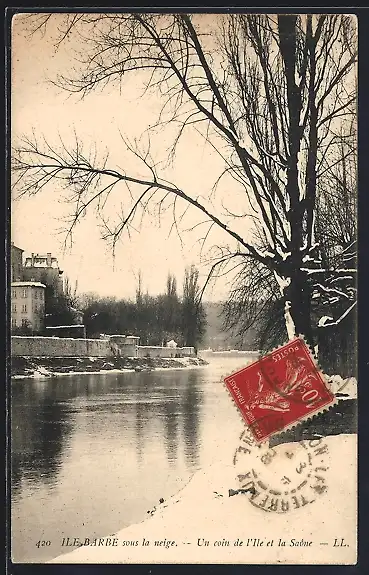 AK Île Barbe, Un coin de l`île sous la neige et la Saône