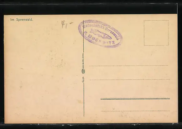 Personenbezogene Daten auf der Rückseite der Karte wurden durch blauen Textmarker unkenntlich gemacht. Die blauen Stellen sind auf die Vorderseite durchgeweicht und wirken sich negativ auf das Postkartenfoto aus
