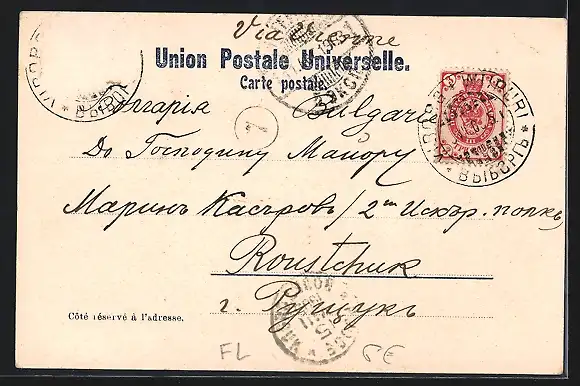Personenbezogene Daten auf der Rückseite der Karte wurden durch blauen Textmarker unkenntlich gemacht. Die blauen Stellen sind auf die Vorderseite durchgeweicht und wirken sich negativ auf das Postkartenfoto aus