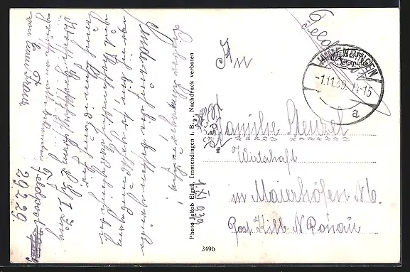 Personenbezogene Daten auf der Rückseite der Karte wurden durch blauen Textmarker unkenntlich gemacht. Die blauen Stellen sind auf die Vorderseite durchgeweicht und wirken sich negativ auf das Postkartenfoto aus