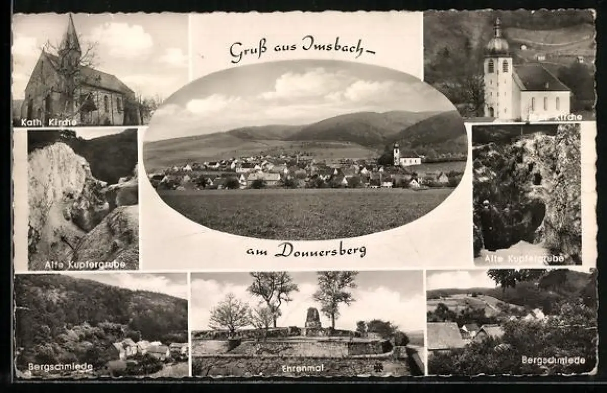AK Imsbach / Pfalz, Ortsansicht, Kath. Kirche, Alte Kupfergrube, Bergschmiede, Ehrenmal