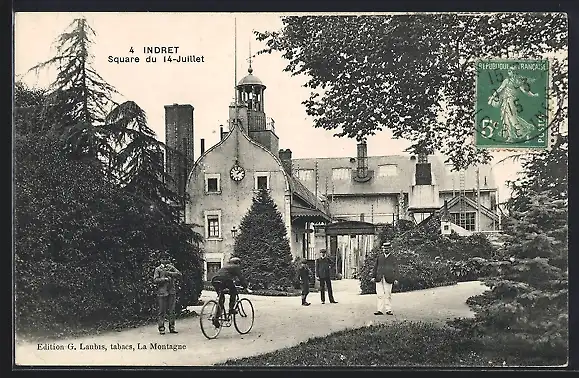 AK Indret, Square du 14-Juillet avec des personnes et un cycliste devant un bâtiment à horloge
