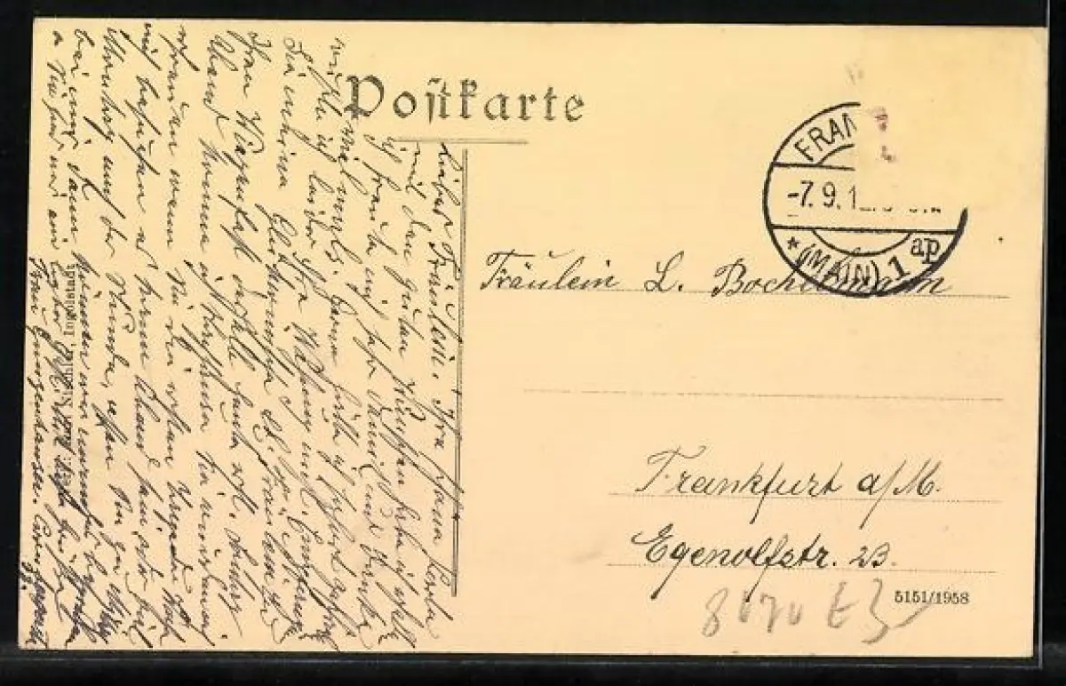Personenbezogene Daten auf der Rückseite der Karte wurden durch blauen Textmarker unkenntlich gemacht. Die blauen Stellen sind auf die Vorderseite durchgeweicht und wirken sich negativ auf das Postkartenfoto aus
