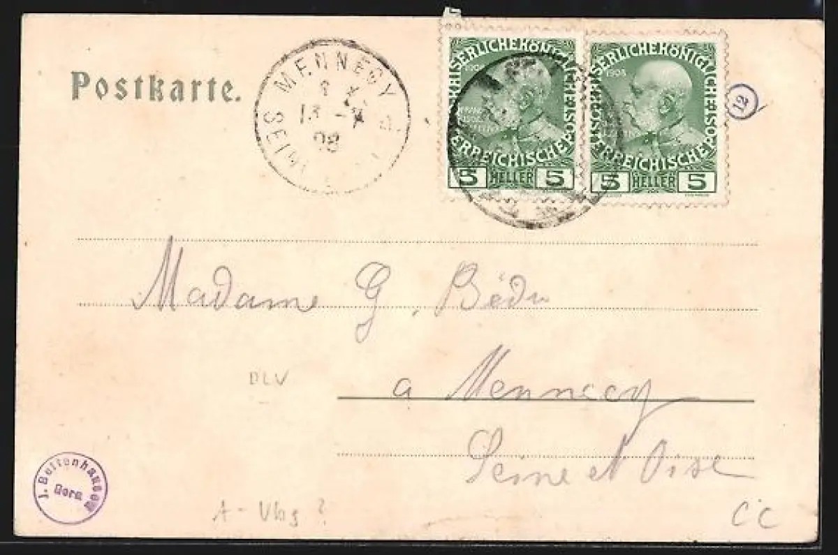 gelaufen 1908, Eckknick li. oben, minimaler Einriss li. unten, guter Zustand
