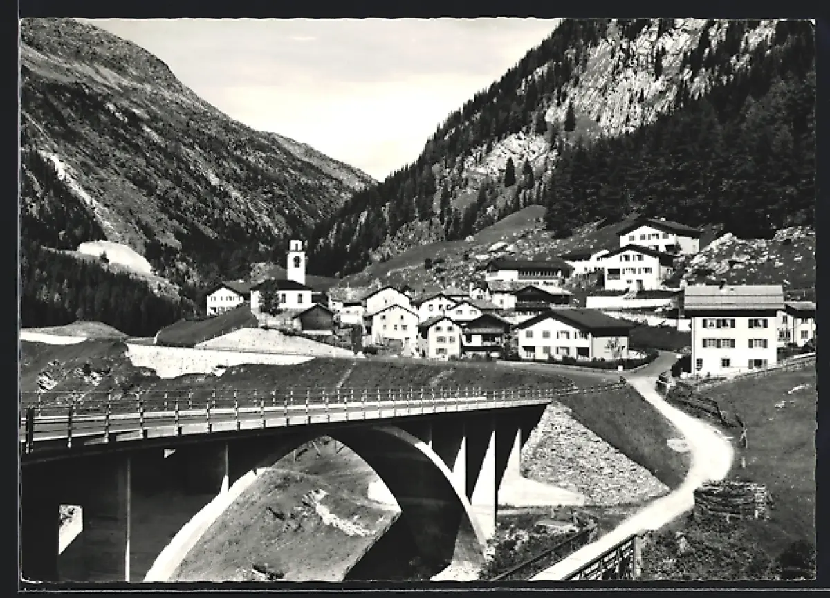 AK Innerferrera /Avers, Ortsansicht mit Brücke und Talpanorama