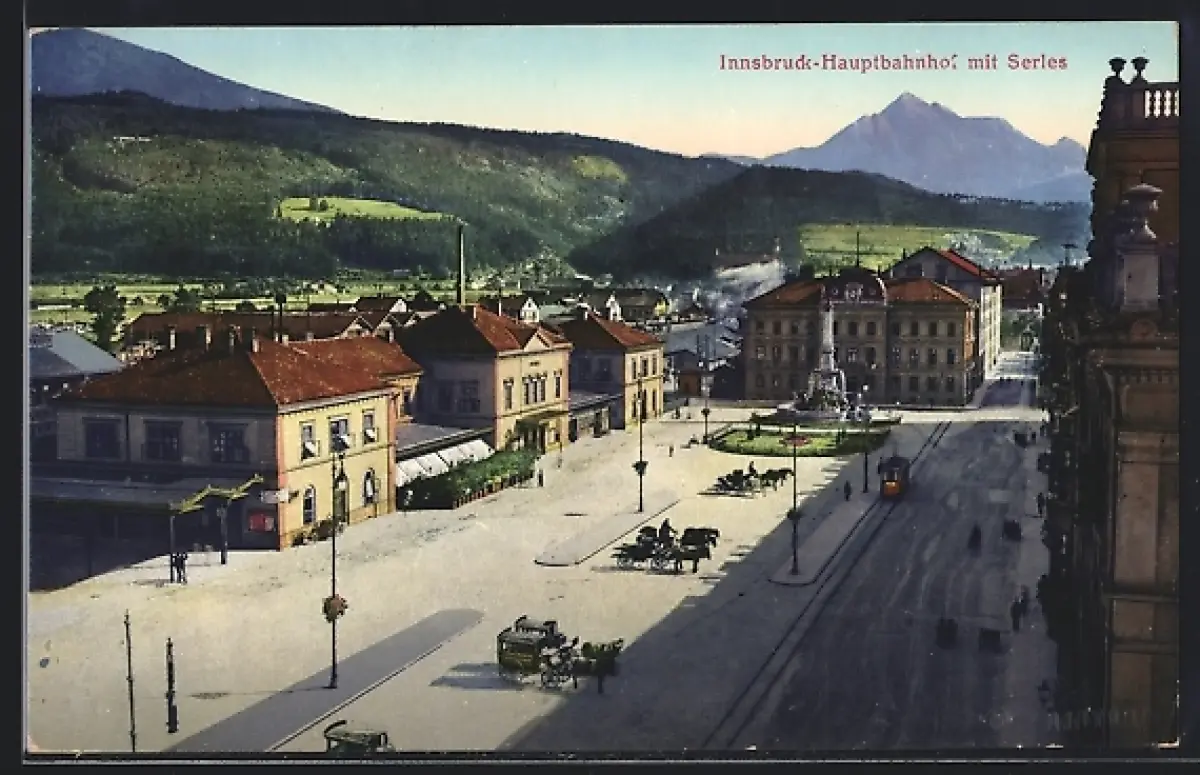 AK Innsbruck, Hauptbahnhof mit Serles, Pferdekutschen