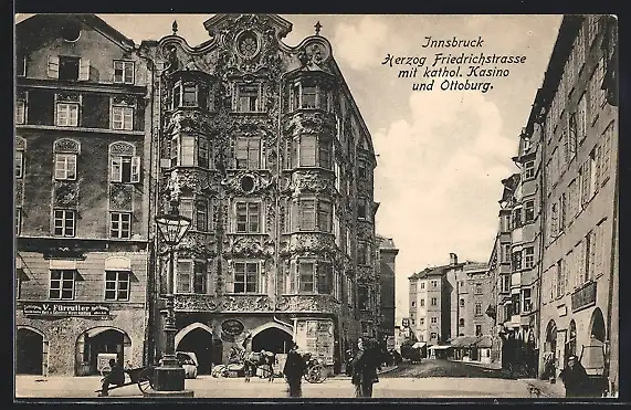 AK Innsbruck, Herzog Friedrichstrasse mit Kurzwarengeschäft V. Fürrutter, katholischem Kasino und Ottoburg