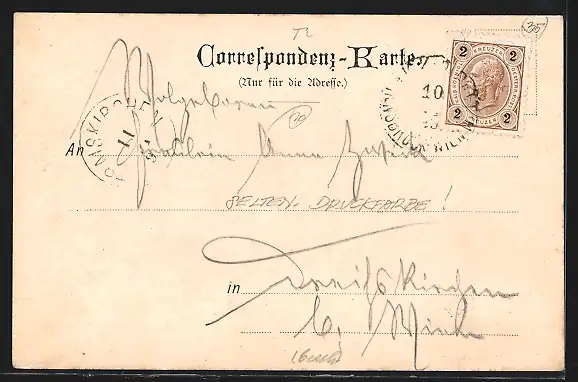 Personenbezogene Daten auf der Rückseite der Karte wurden durch blauen Textmarker unkenntlich gemacht. Die blauen Stellen sind auf die Vorderseite durchgeweicht und wirken sich negativ auf das Postkartenfoto aus