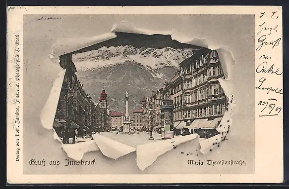AK Innsbruck, Partie an der Maria Theresienstrasse mit Bergpanorama im Hintergrund