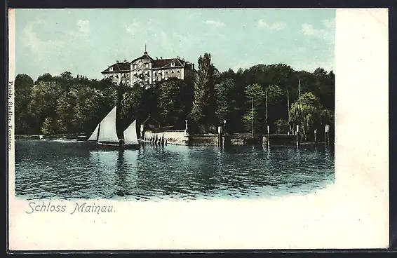 AK Insel Mainau /Bodensee, Schloss Mainau vom Wasser aus, mit Segelboot