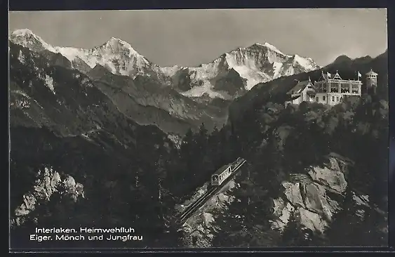 AK Interlaken, Heimwehfluh mit Bergbahn, Eiger, Mönch und Jungfrau