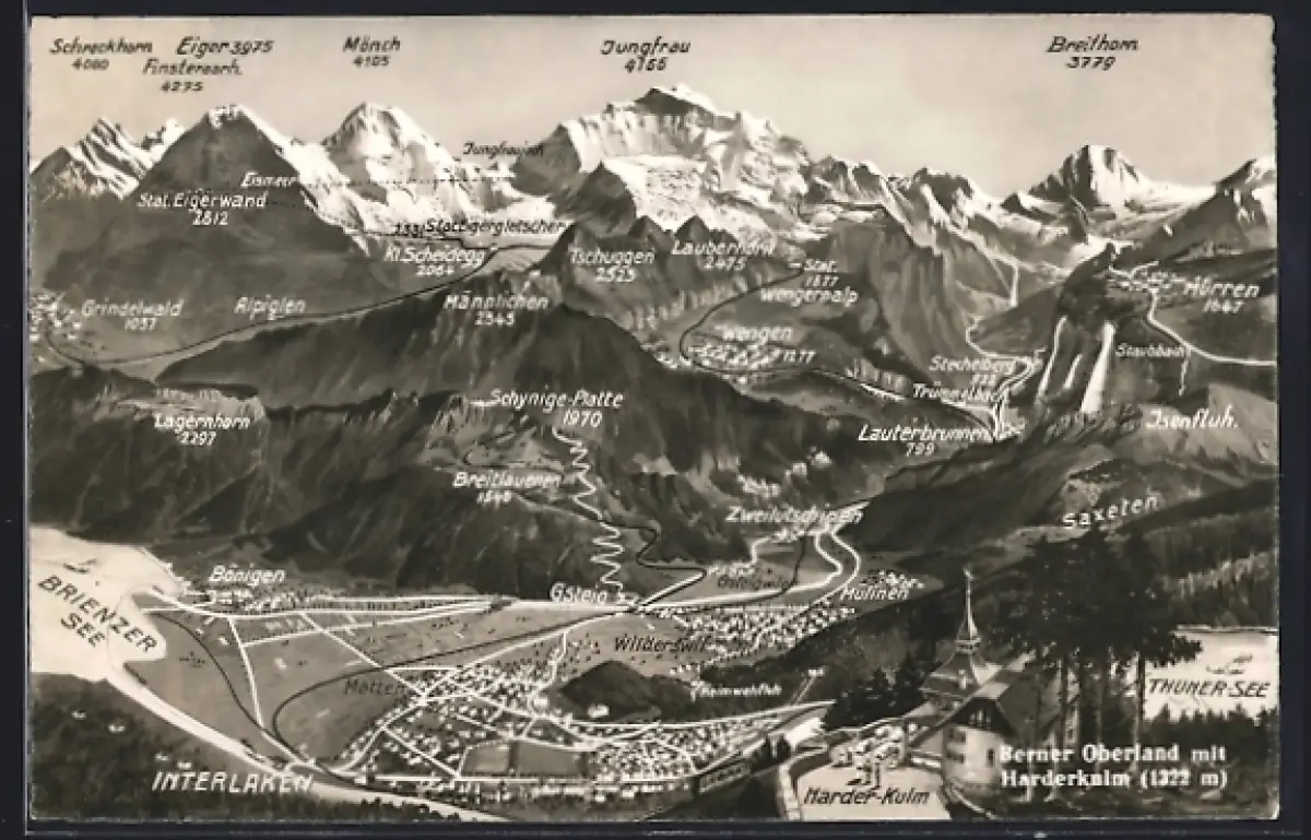 AK Interlaken, Ortsansicht mit Eiger, Mönch und Jungfrau und umliegenden Orten