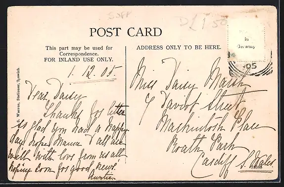 alte Ansichtskarte, gelaufen 1905, Briefmarke entfernt, rückseitig Oberflächenschaden, Eckknick li. oben, guter Zustand
