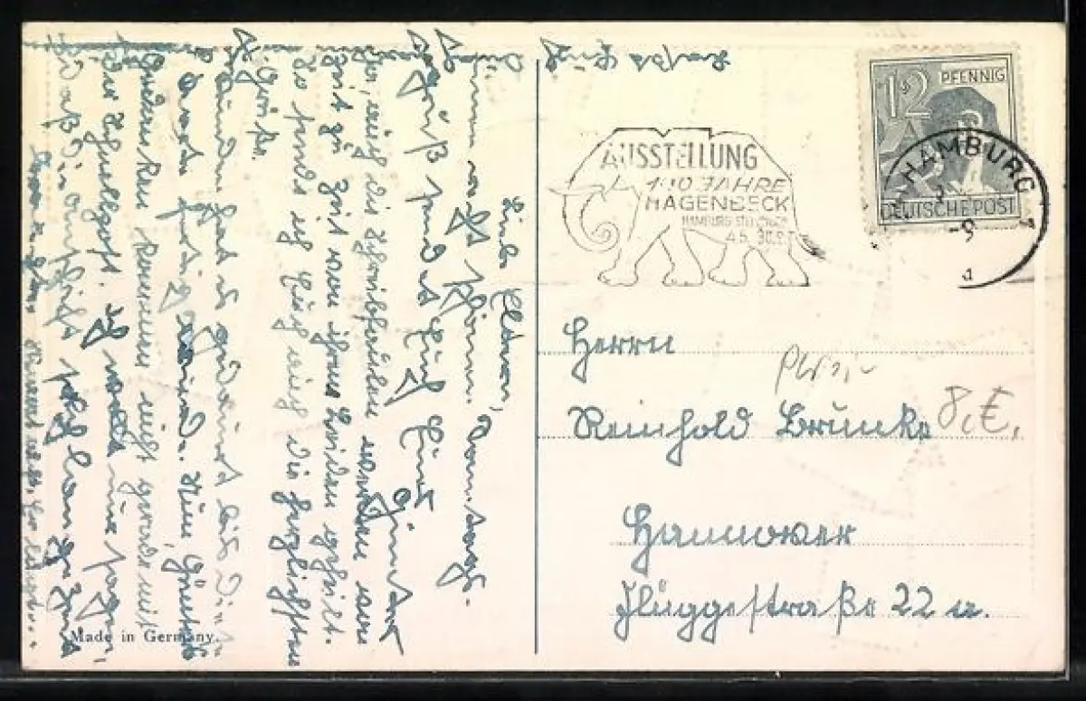 Personenbezogene Daten auf der Rückseite der Karte wurden durch blauen Textmarker unkenntlich gemacht. Die blauen Stellen sind auf die Vorderseite durchgeweicht und wirken sich negativ auf das Postkartenfoto aus