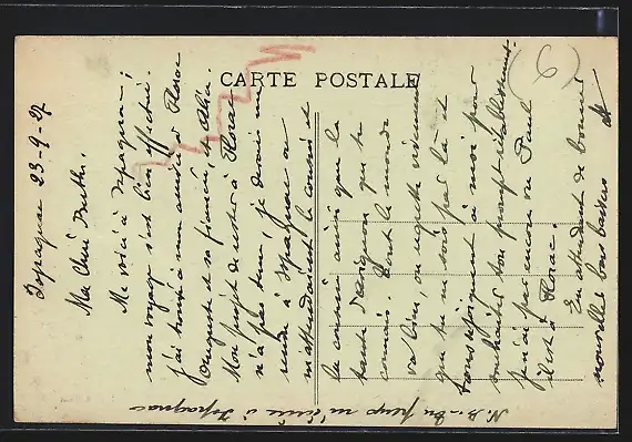 Personenbezogene Daten auf der Rückseite der Karte wurden durch blauen Textmarker unkenntlich gemacht. Die blauen Stellen sind auf die Vorderseite durchgeweicht und wirken sich negativ auf das Postkartenfoto aus