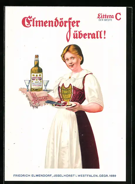 AK Isselhorst, Kellnerin serviert Elmendörfer Korn, Littera C - Der Beste, Reklame