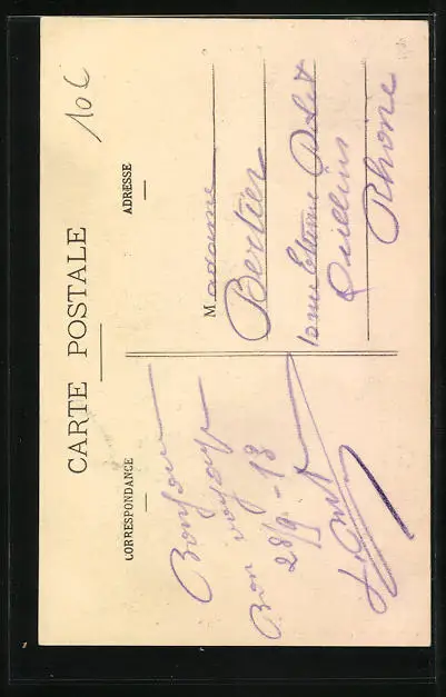 Personenbezogene Daten auf der Rückseite der Karte wurden durch blauen Textmarker unkenntlich gemacht. Die blauen Stellen sind auf die Vorderseite durchgeweicht und wirken sich negativ auf das Postkartenfoto aus