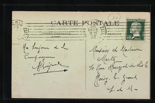 Personenbezogene Daten auf der Rückseite der Karte wurden durch blauen Textmarker unkenntlich gemacht. Die blauen Stellen sind auf die Vorderseite durchgeweicht und wirken sich negativ auf das Postkartenfoto aus