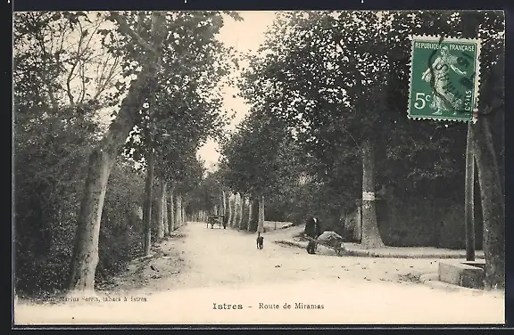 AK Istres, Route de Miramas avec arbre en allée et passant à pied