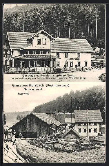 AK Ittersbach-Holzbach /Schwarzwald, Gasthaus und Pension zum grünen Wald, Sägewerk, Forstwirtschaft