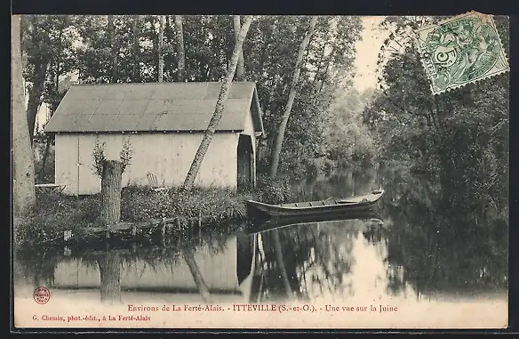 AK Itteville, Une vue sur la Juine avec un bateau et une cabane au bord de l`eau