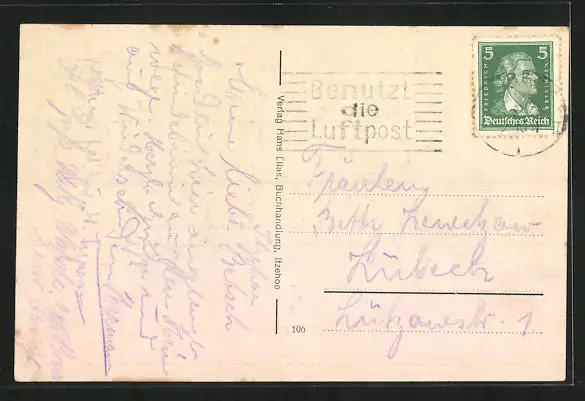 Personenbezogene Daten auf der Rückseite der Karte wurden durch blauen Textmarker unkenntlich gemacht. Die blauen Stellen sind auf die Vorderseite durchgeweicht und wirken sich negativ auf das Postkartenfoto aus