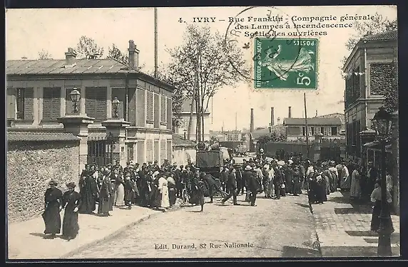 AK Ivry, Rue Franklin et sortie des ouvrières de la Compagnie des Lampes à Incandescence