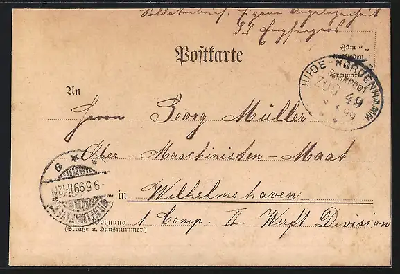 alte Ansichtskarte, gelaufen 1899, oben und re. beschnitten
