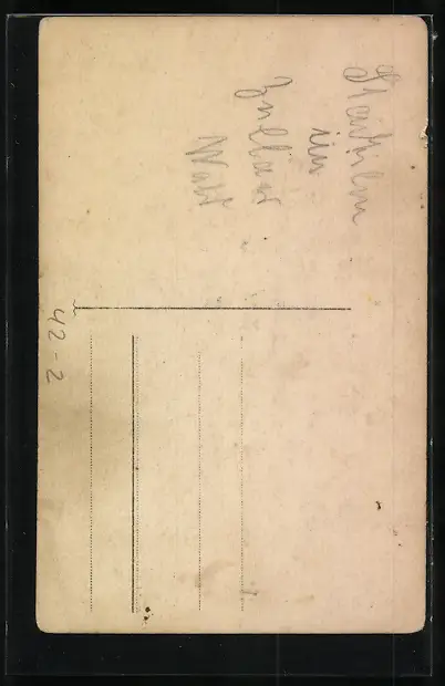 Personenbezogene Daten auf der Rückseite der Karte wurden durch blauen Textmarker unkenntlich gemacht. Die blauen Stellen sind auf die Vorderseite durchgeweicht und wirken sich negativ auf das Postkartenfoto aus