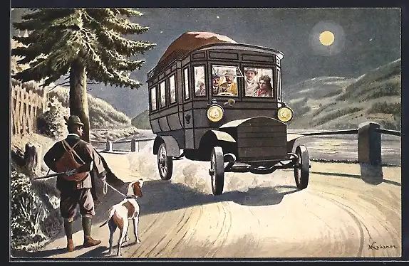 AK Jäger mit Hund und Postwagen, K. K. Automobilpost 1908
