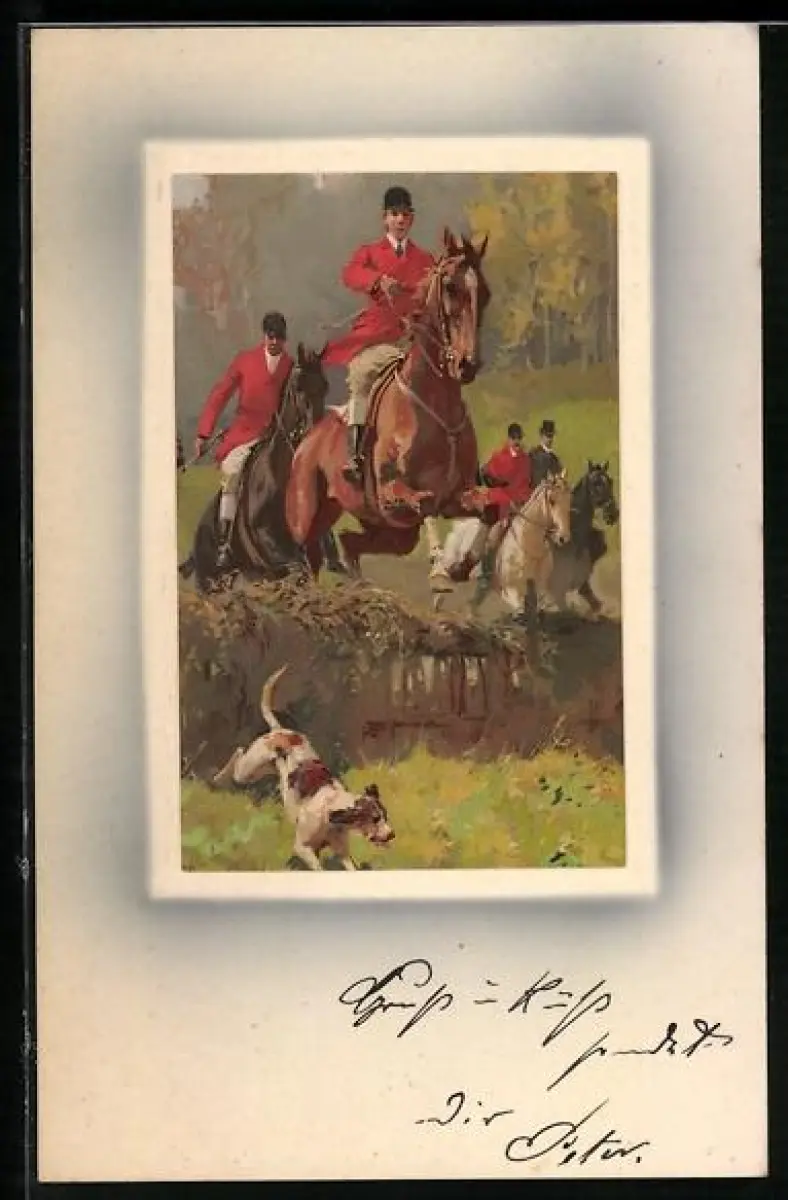 AK Jäger zu Pferde überwinden ein Hindernis, Jagdhund