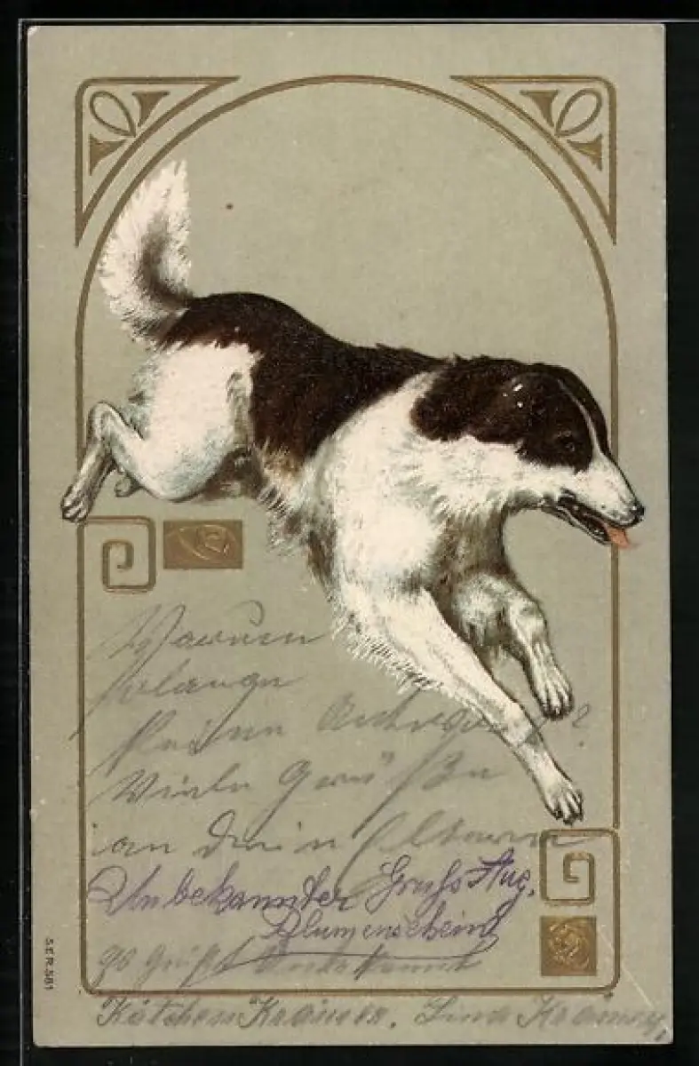 AK Jagdhund im Sprung, Ornament-Rahmen