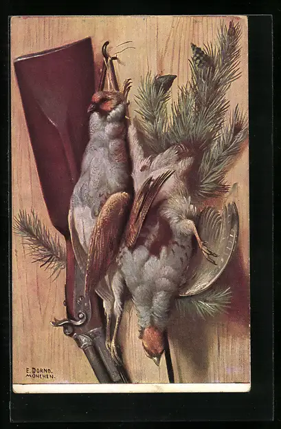 AK Jagdstillleben, erlegtes Federwild neben dem Gewehr des Jägers