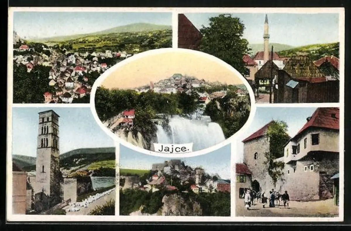 AK Jajce, Teilansicht mit Burg, Turm, Ortspartie