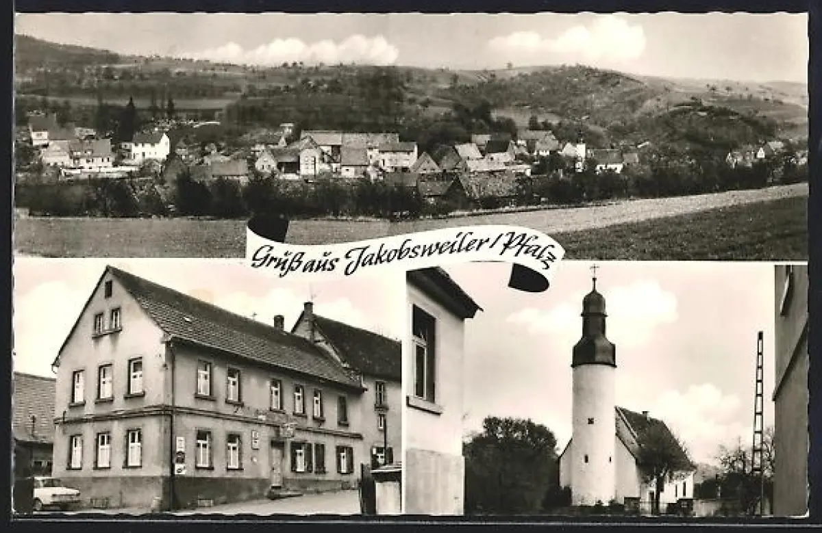 AK Jakobsweiler am Donnersberg, Gasthaus zur Krone, Elise Kron, Ortsansicht vom Feld aus, Ansicht der Kirche