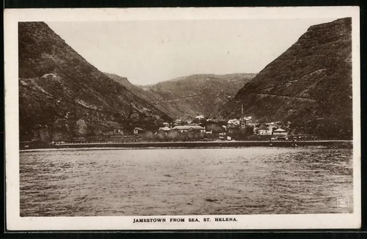 AK Jamestown, View from Sea, Kirchturm und Berge