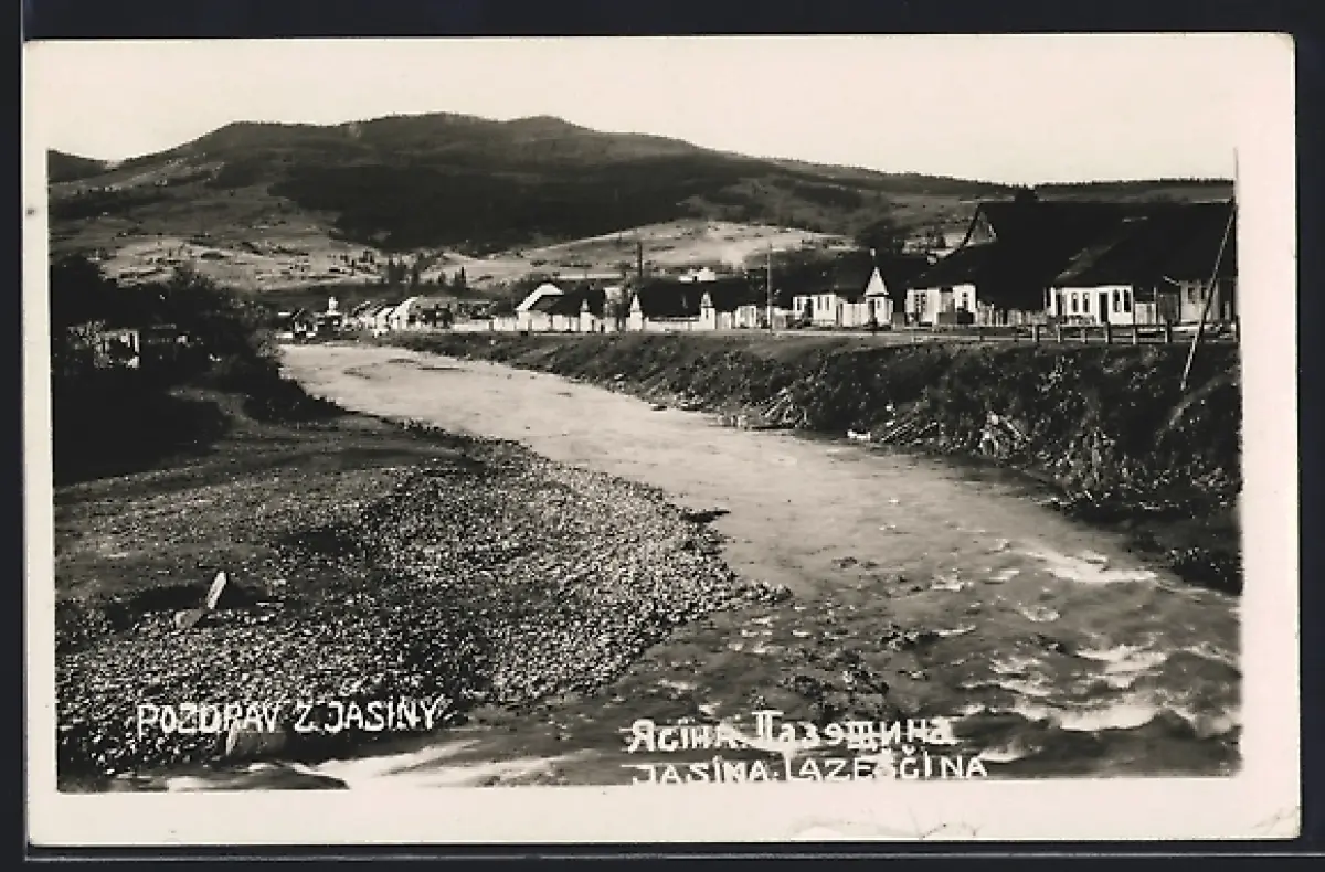 AK Jasina, Lazescina, Flusspartie mit Ortspanorama