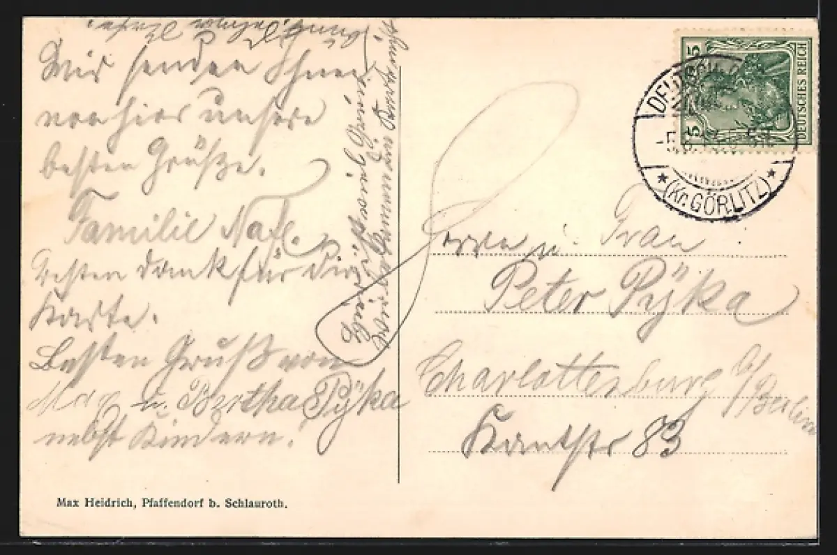 Personenbezogene Daten auf der Rückseite der Karte wurden durch blauen Textmarker unkenntlich gemacht. Die blauen Stellen sind auf die Vorderseite durchgeweicht und wirken sich negativ auf das Postkartenfoto aus