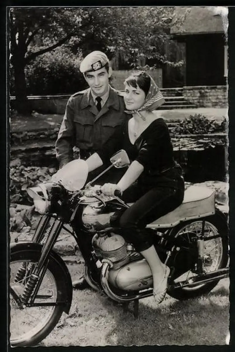 AK Jawa 350 ccm Motorrad, Flotte Fahrerin und Soldat in Uniform