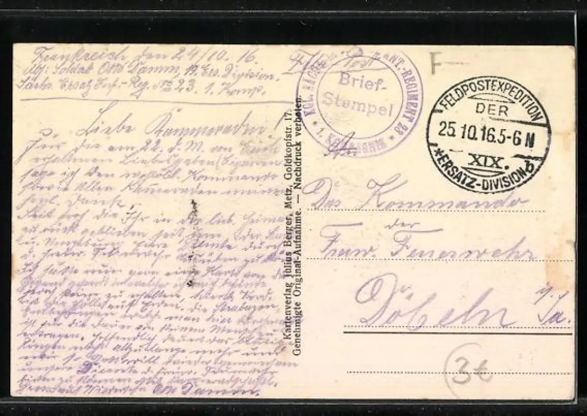 alte Ansichtskarte, gelaufen 1916, rückseitig Oberflächenschaden, guter Zustand